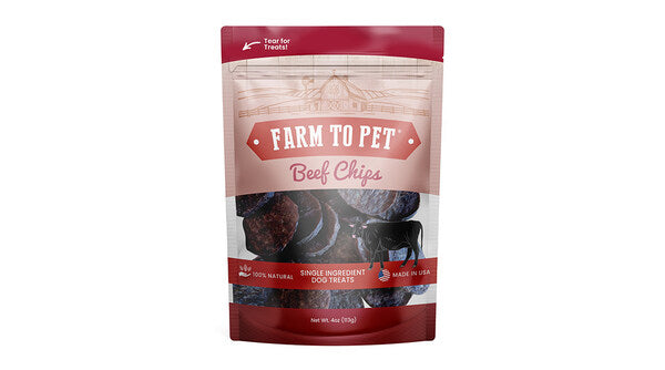 Farm to Pet Beef Chips pack the rich flavor and protein of pure beef in every crunchy bite! Made in the US of 100% all-natural, human-grade beef, these healthy dog treats are loaded with essential nutrients like iron, magnesium and B12 and zero artificial ingredients. What's more, these nutrtitious snacks for dogs - and cats! - come from only beef round, one of the leanest cuts of meat, without any hormones, byproducts or preservatives. Tasty and mess-free, these single-ingredient pet treats also make pawsome high-value training rewards!
