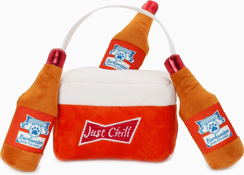 - Inside the cooler, three crinkly faux beer bottles await discovery, each bursting with an irresistible squeak to keep your pup’s tail wagging.