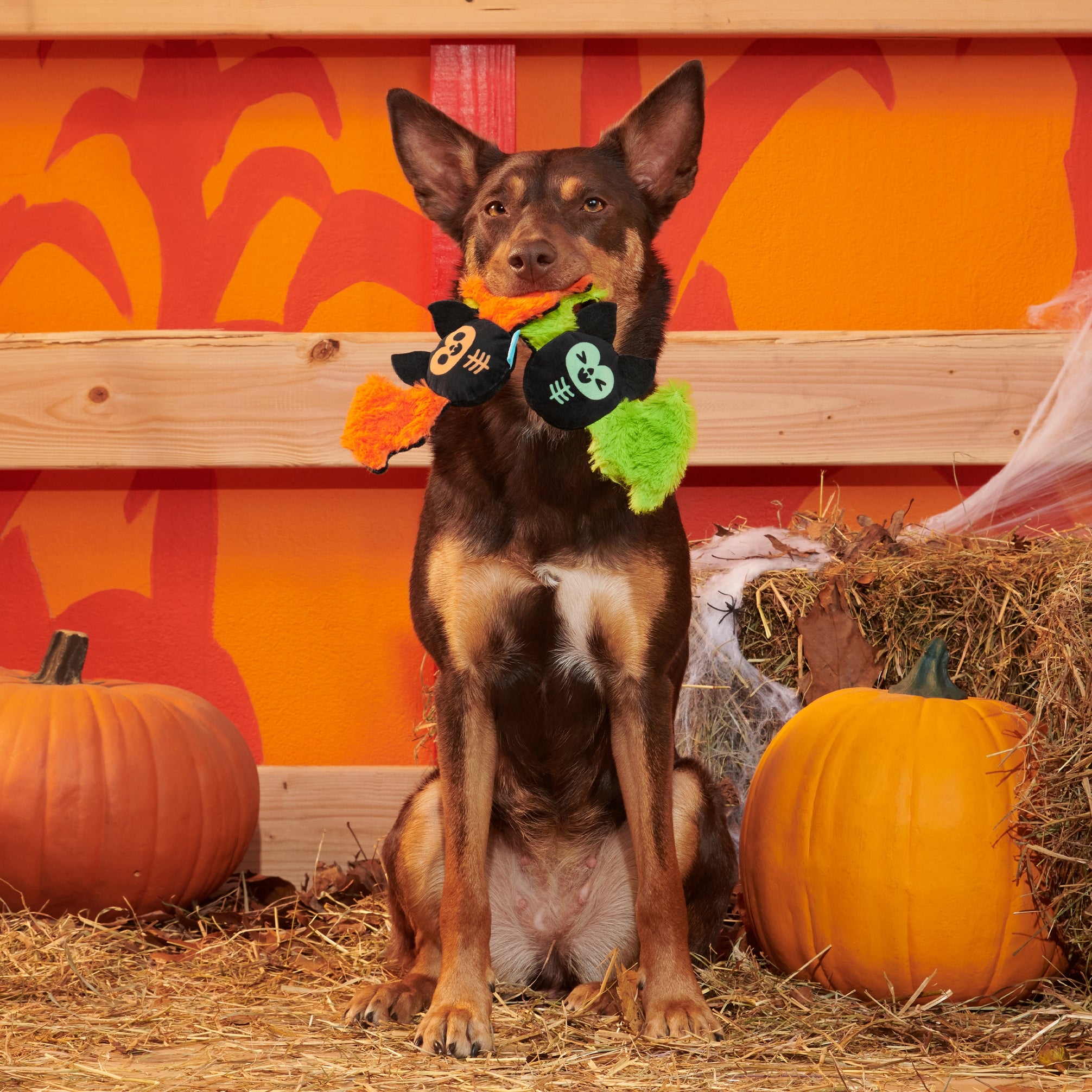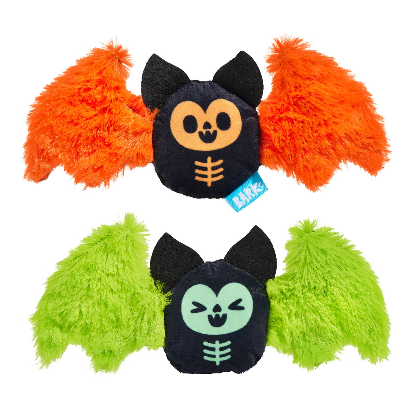 This pair of halloween bat dog toys will happily hang with your pup. Flutter & Fang's two squeakers, long & strong hair, crazy crinkle, and whip-N-flip wings make them always ready for a good time—as long as it's not daytime! Plus they're so cute, it's just batty.