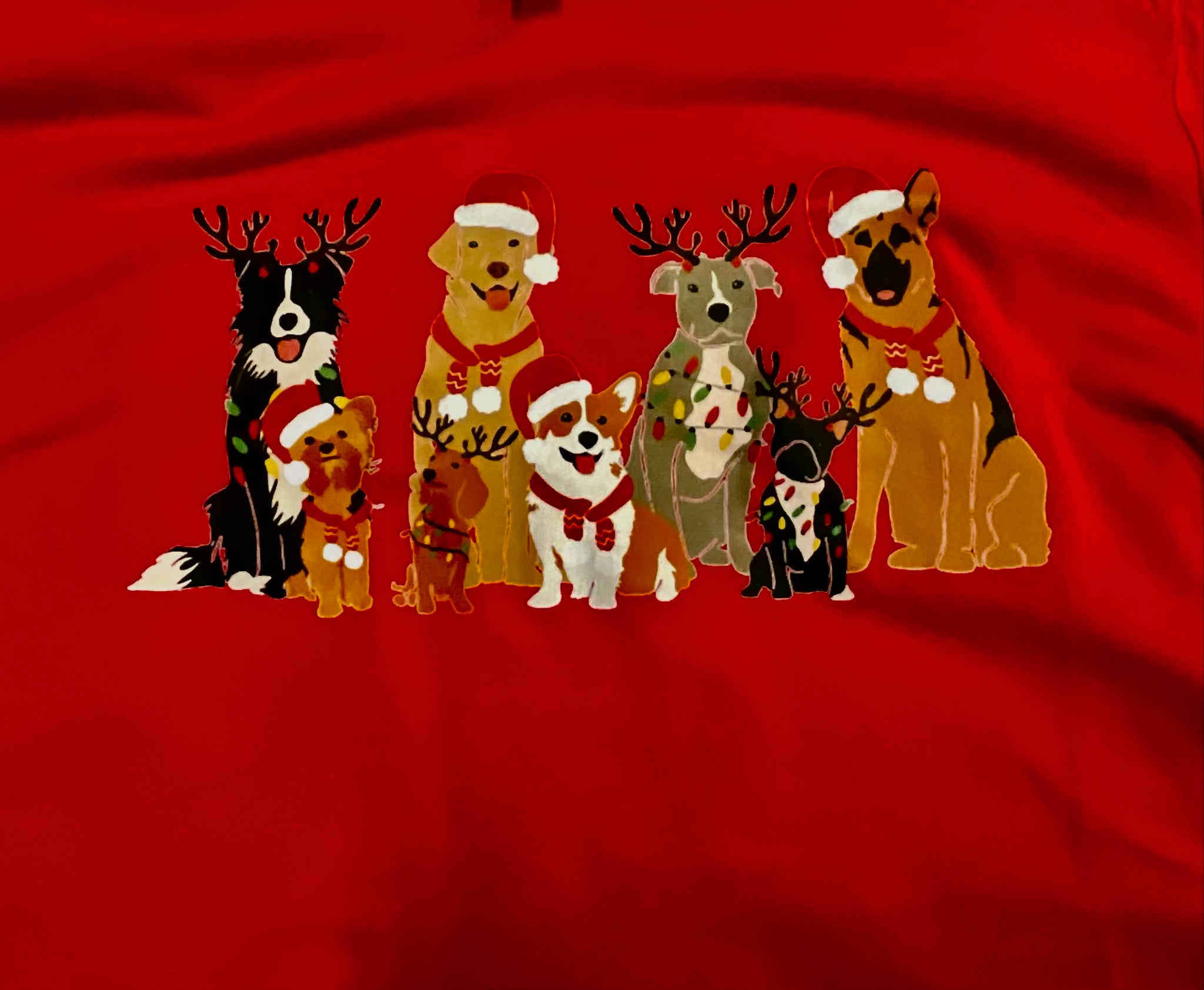 Bella & Canvas tee with festive group of dogs wearing holiday hats and lights. 100% cotton.