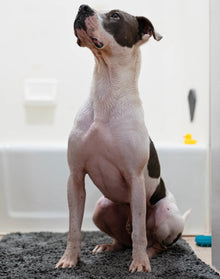 This microfiber mat with non-slip backing will soak up to 7 times its weight in water! Let’s not forget the hair and mud and dirt that goes along with your mutt. Quick drying, soft and snuggly, this mat can also be used as a towel with the ‘handy’ pocket attachments on the back.