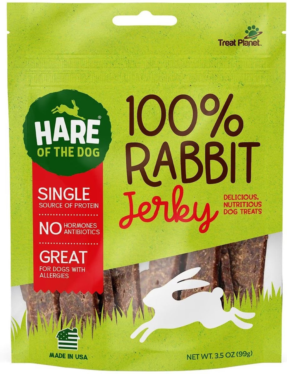 Hare of the Dog 100% Rabbit Jerky Dog Treats are nutritious, single ingredient treats your dog will love! Made in the USA from 100% Rabbit, nothing else. Nothing artificial. No fillers or additives. Great for dogs with common protein allergies such as pork, chicken and beef.
