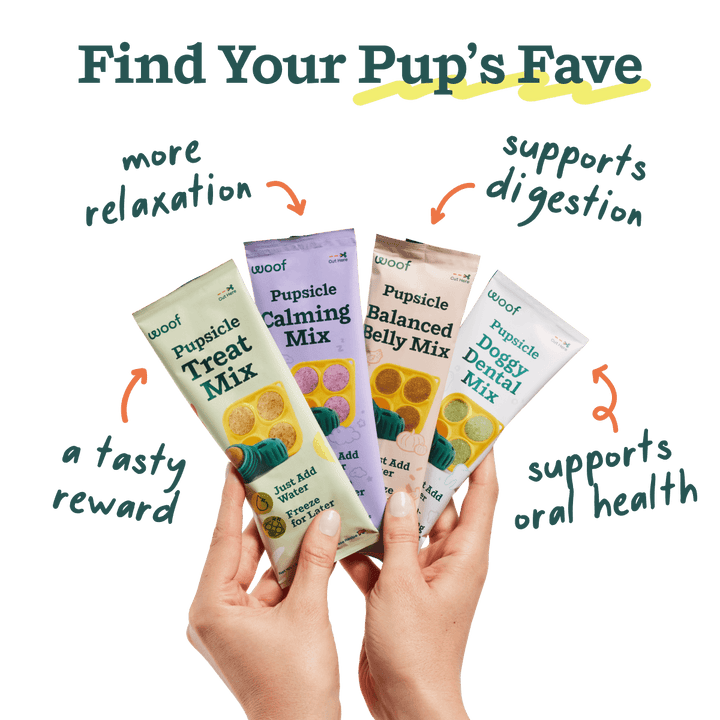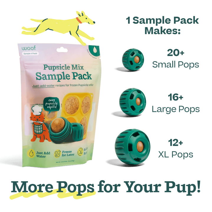 Let your pup try four flavors of Pupsicle Mix with the Pupsicle Mix Sample Pack! Explore delicious, nourishing Bacon & Cheese Mix, Calming Mix designed to support a calm and happy pup, Balanced Belly Mix to soothe tummies and support a healthy gut, and Doggy Dental Mix to turn your Pupsicle into a teeth-cleaning powerhouse. Just add water and freeze in the Pupsicle Treat Tray to create Pupsicle refills on repeat! Each Pupsicle Mix Sample Pack lets you make four large pops per sachet, for a total of 16 pops.