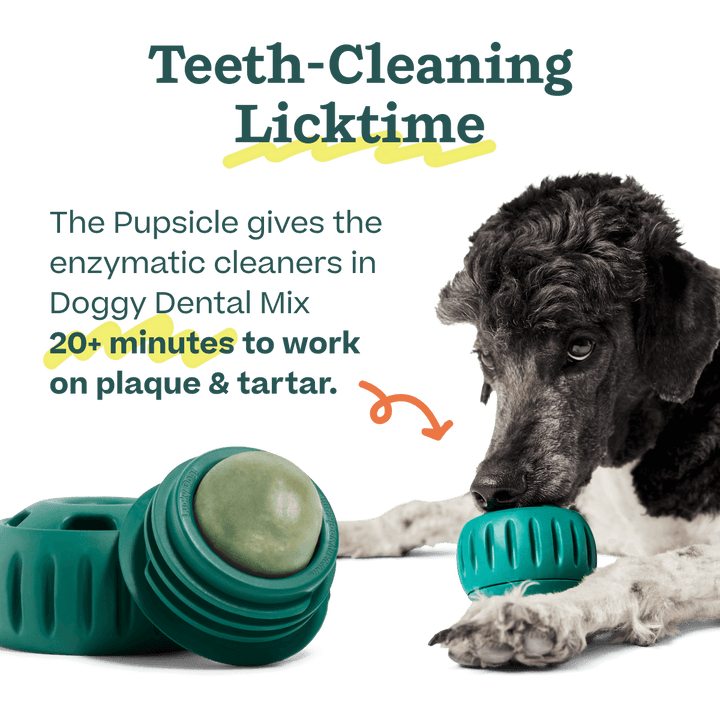 Just mix with water and freeze in the Pupsicle Treat Tray to turn your Pupsicle into a teeth-cleaning powerhouse. Open your Pupsicle, drop in a Doggy Dental pop, and let your pup clean their own teeth!