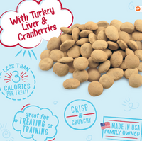 These ORIGINAL Treats are crafted with real turkey liver for protein and antioxidant-rich cranberries right here in the USA. Made without soy, corn, artificial flavors or preservatives, they’re baked to perfection for crunchiness and taste.