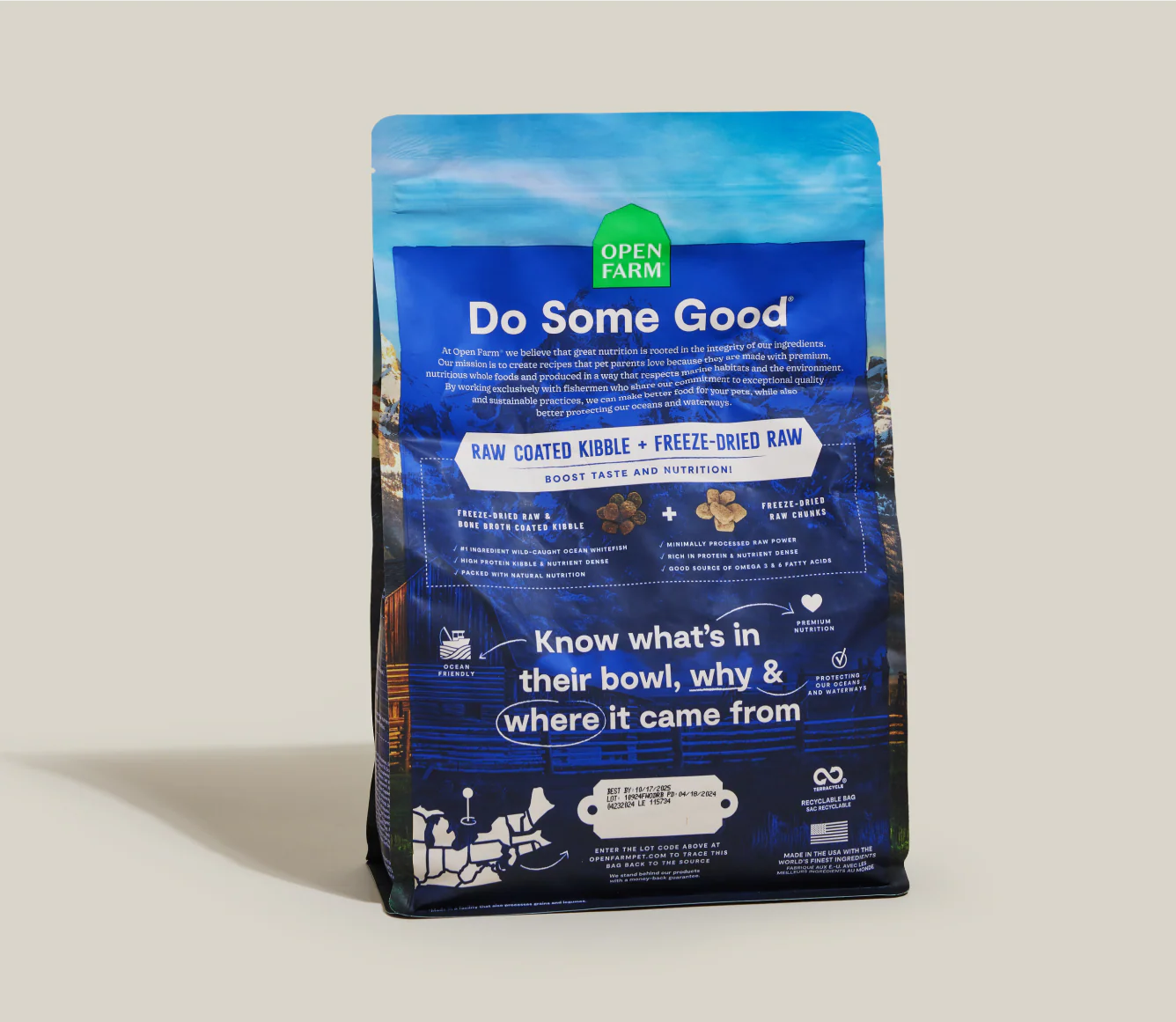ReWild their diet with this multi-animal protein blend of Ocean Wise recommended wild-caught whitefish, salmon and rockfish, covered in a bone broth and freeze dried raw coating. Bonus freeze dried raw chunks give this grain- and legume-free kibble a protein-packed boost, while superfoods like pumpkin and sweet potato ensure complete and balanced nutrition.