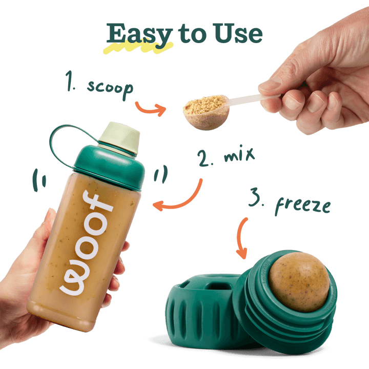 Mix your Treat Mix and water in the shaker bottle, choosing a ratio of 1:2 or 1:3 to decide how many pops to make per bag. Once mixed, pour the mixture into your Pupsicle Treat Tray and freeze. When ready, open the tray, drop in a pop, and let your pup enjoy homemade happiness!